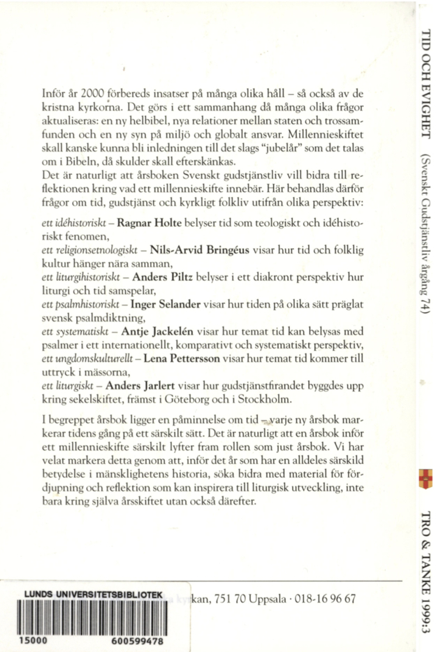 Det är naturligt att årsboken Svenskt gudstjänstliv vill bidra till reflektionen kring vad ett millennieskifte innebär. Här behandlas därför frågor om tid, gudstjänst och kyrkligt folkliv utifrån olika perspektiv: