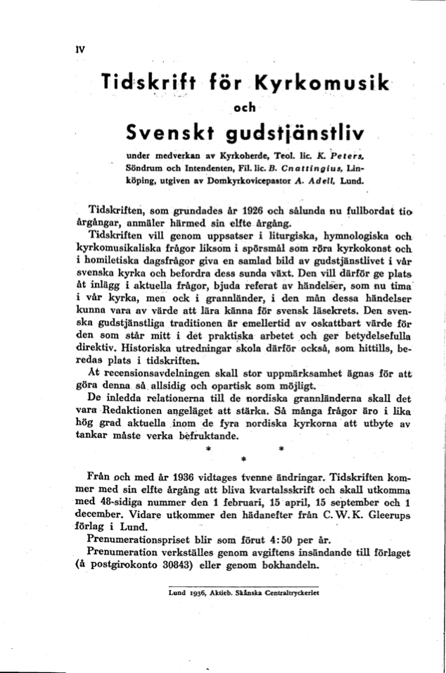 Vol 11 (1936): Tidskrift för kyrkomusik och svenskt gudstjänstliv Årgång 11 1936 häfte 1