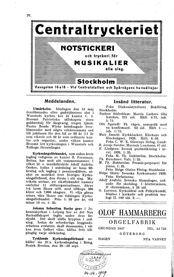 Tidskrift för kyrkomusik och svenskt gudstjänstliv Årgång 4 1929 Häfte 7-8